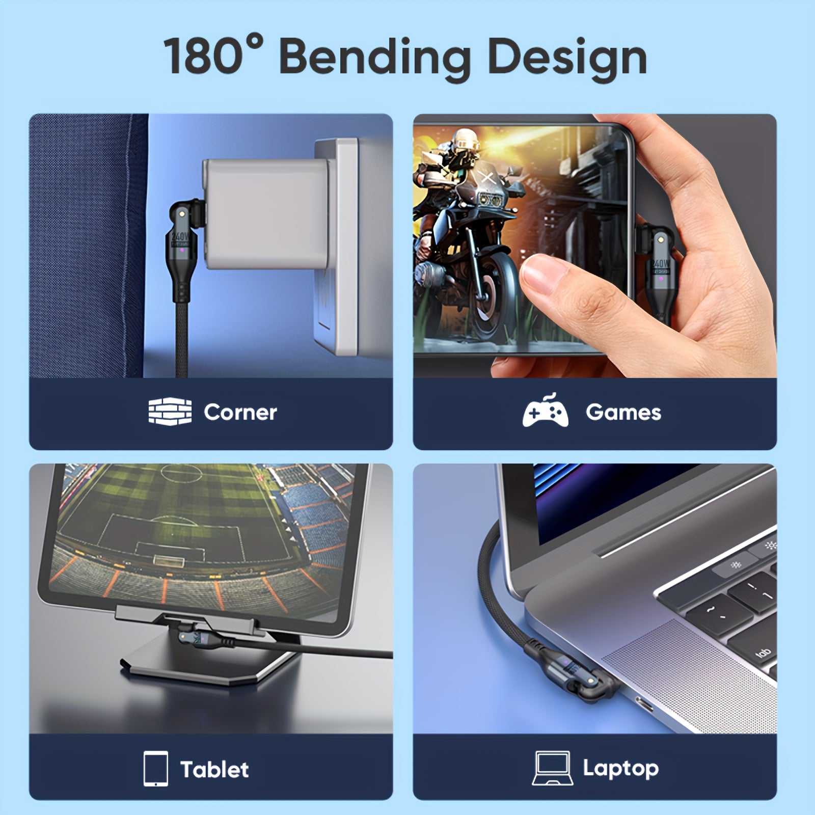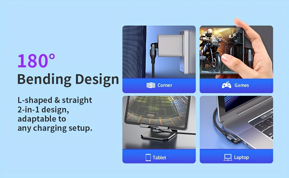A6: Yes, the cable features a 180° bending design with L-shaped and straight options. This flexible design makes it ideal for use in various environments, such as charging from tight corners, gaming, or using devices in vehicles.