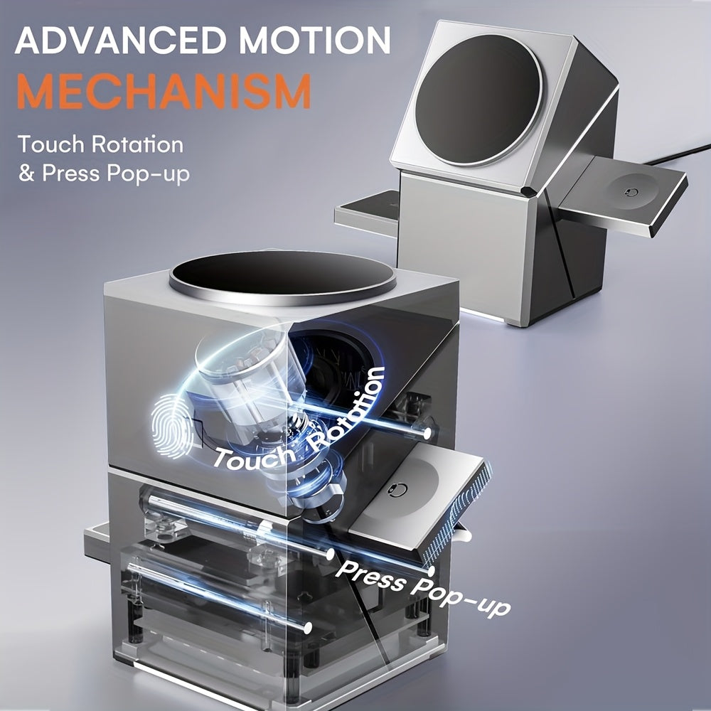 The package contains: a 3-in-1 wireless charging dock, a 15W power adapter, a Type-C cable, and a user guide. This charging station can power three devices at once. It features an automatic rotating phone charger and a pop-up base designed specifically for your watch and headphones. Experience genuine 15W rapid wireless charging with our device, which adheres to Qi2 standards, ensuring outstanding performance and wide compatibility.