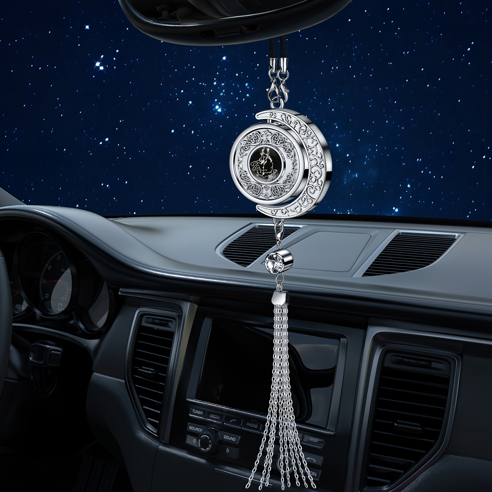 Elegant Crescent Moon Car Charm - Zodiac Series, Metal with Tassel & Bead Accents, DIY Perfume Locket for Rearview Mirror Hanging, Ideal Gift in High-End Gift Box (Perfume Not Included)