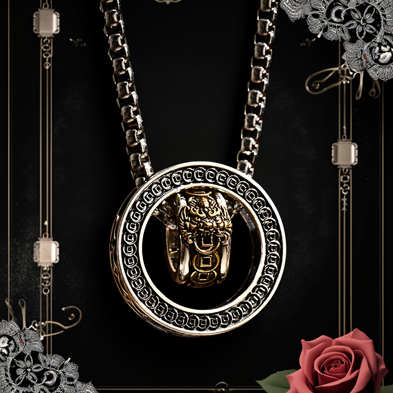 Men's Gothic Double Round Rotating Fengshui Necklace - 23.62inch Long Chain with Golden-Tone Lion Head Pendant, Large Statement Jewelry for Father's Day, Birthday, Christmas Gifts - Luxury Men's Fashion Accessory