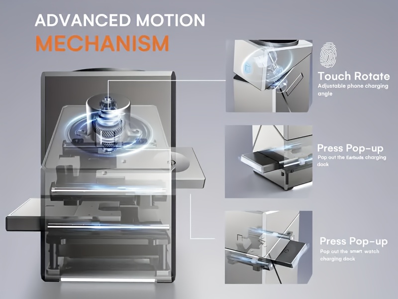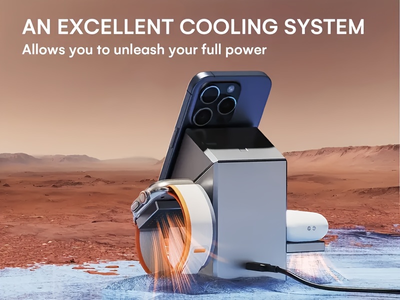 The package contains: a 3-in-1 wireless charging dock, a 15W power adapter, a Type-C cable, and a user guide. This charging station can power three devices at once. It features an automatic rotating phone charger and a pop-up base designed specifically for your watch and headphones. Experience genuine 15W rapid wireless charging with our device, which adheres to Qi2 standards, ensuring outstanding performance and wide compatibility.