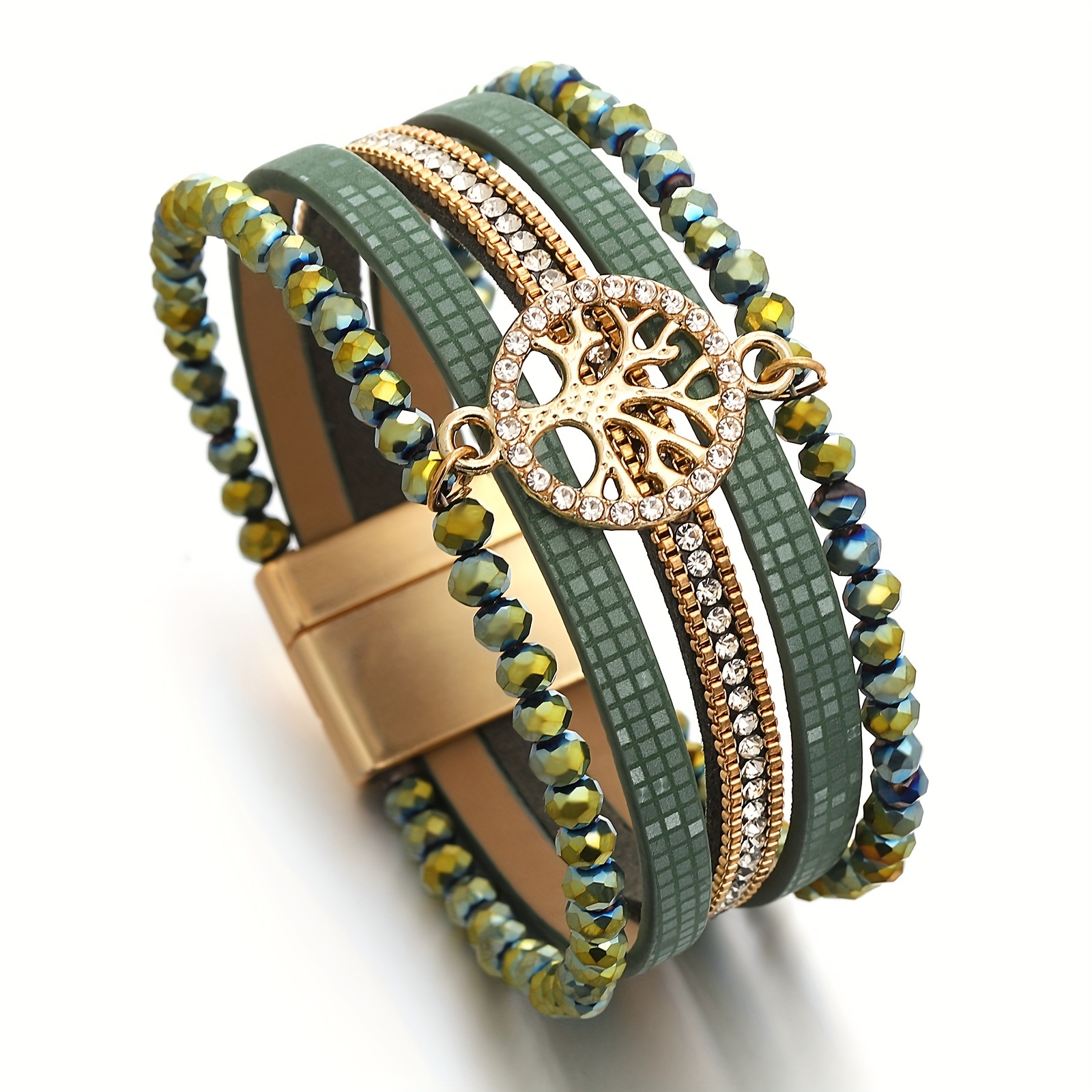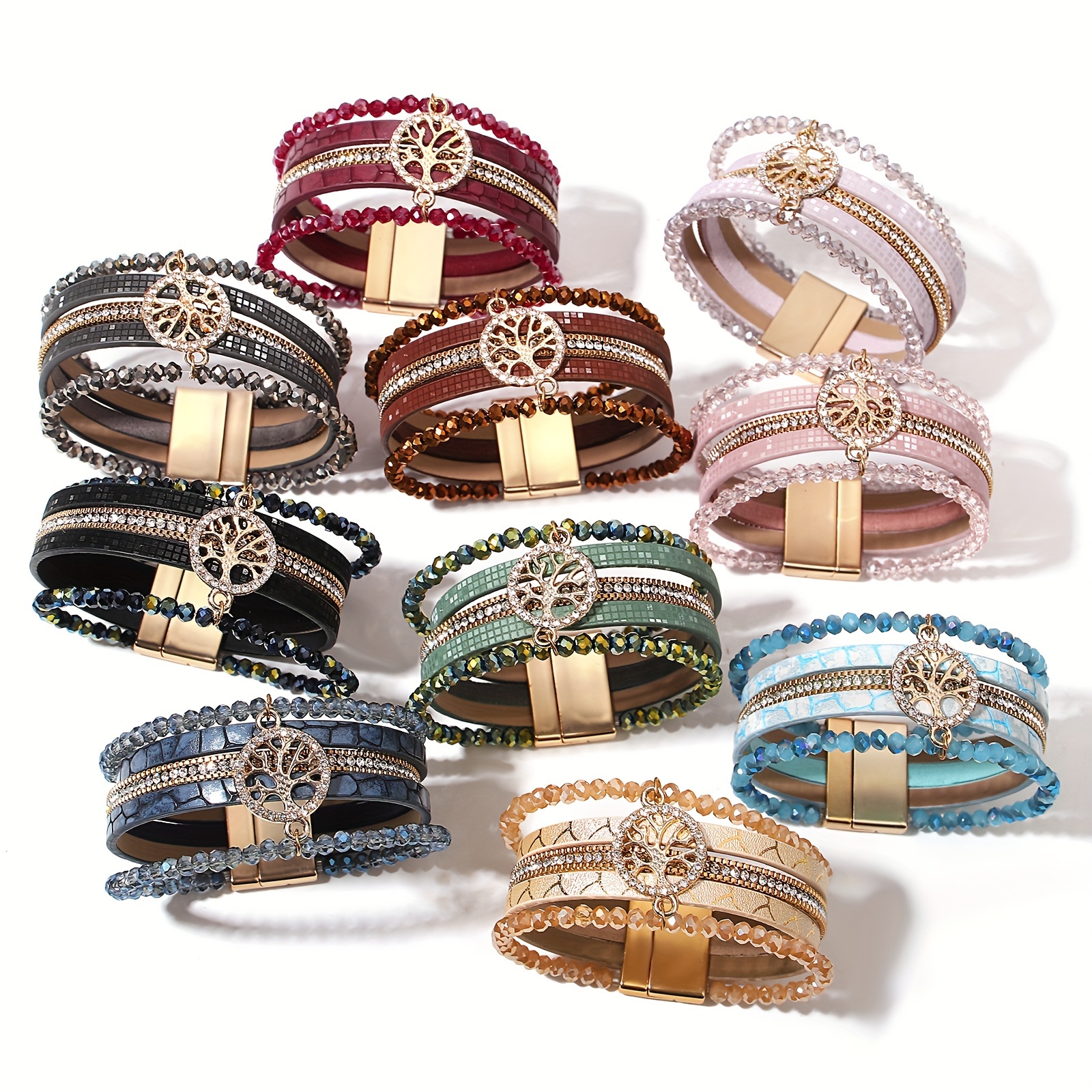 One Piece of Bohemian-Style Faux Leather Wrap Bracelets Featuring a Tree of Life Charm, Adorned with Artificial Crystal Beads. These Multilayer Bangles Are Ideal for Women And Suitable for Everyday Use As Well As Festive Occasion